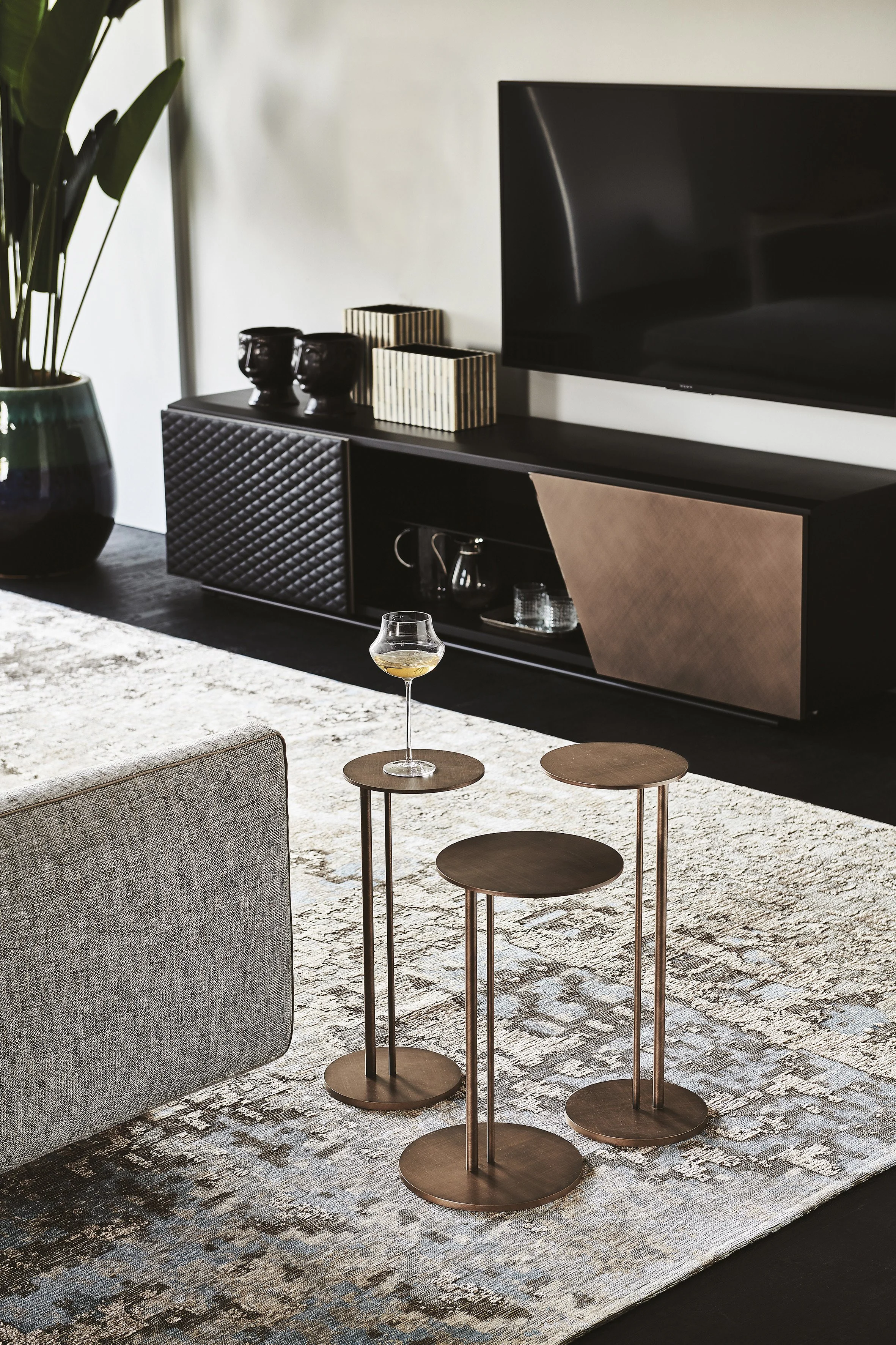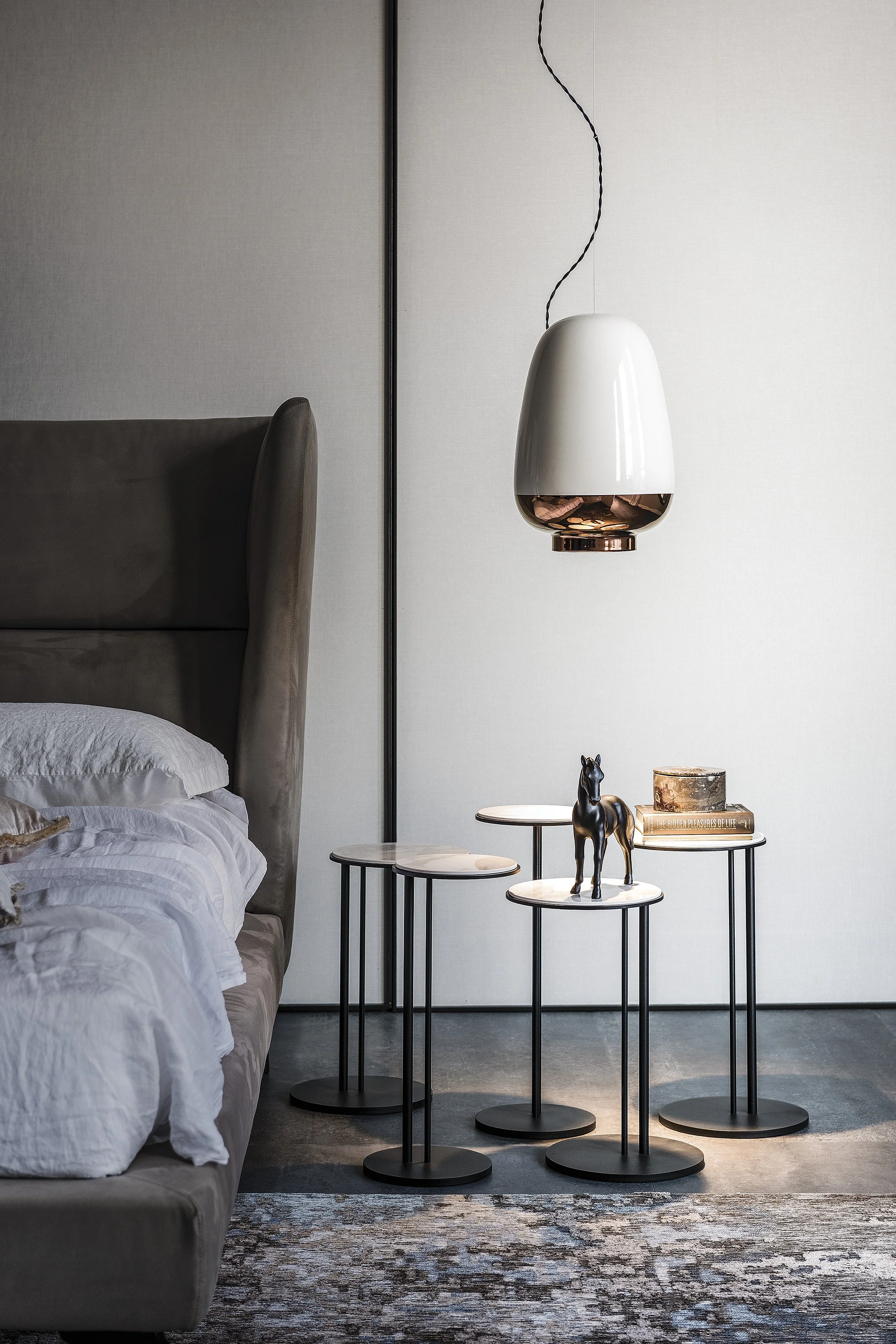 This collection of coffee/accent tables really set themselves apart from other pieces because of their elegance and practicality. They are lightweight and easy to move around, as you move around your home. They make for great drink tables that move with you. Place them closer to the sofa, in between two arm chairs, or anywhere you might need them. That is whats so great about tables that are not just stationary! Their flexibility allows you too to be flexible. The base is made up of two narrow legs of different diameters, with porcelain tops, or a brushed top as well.