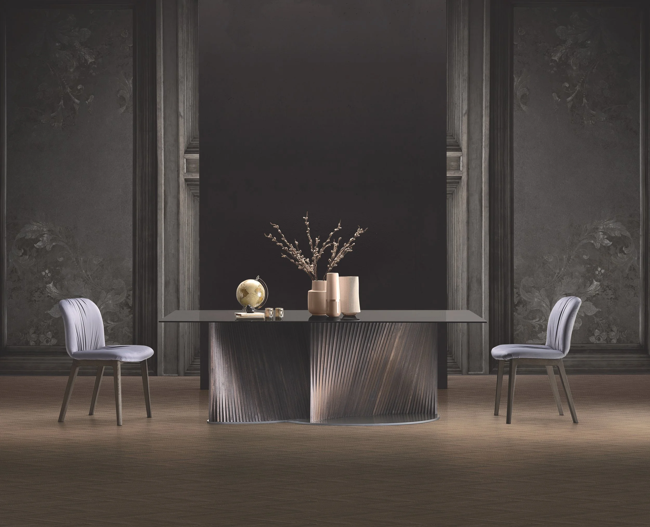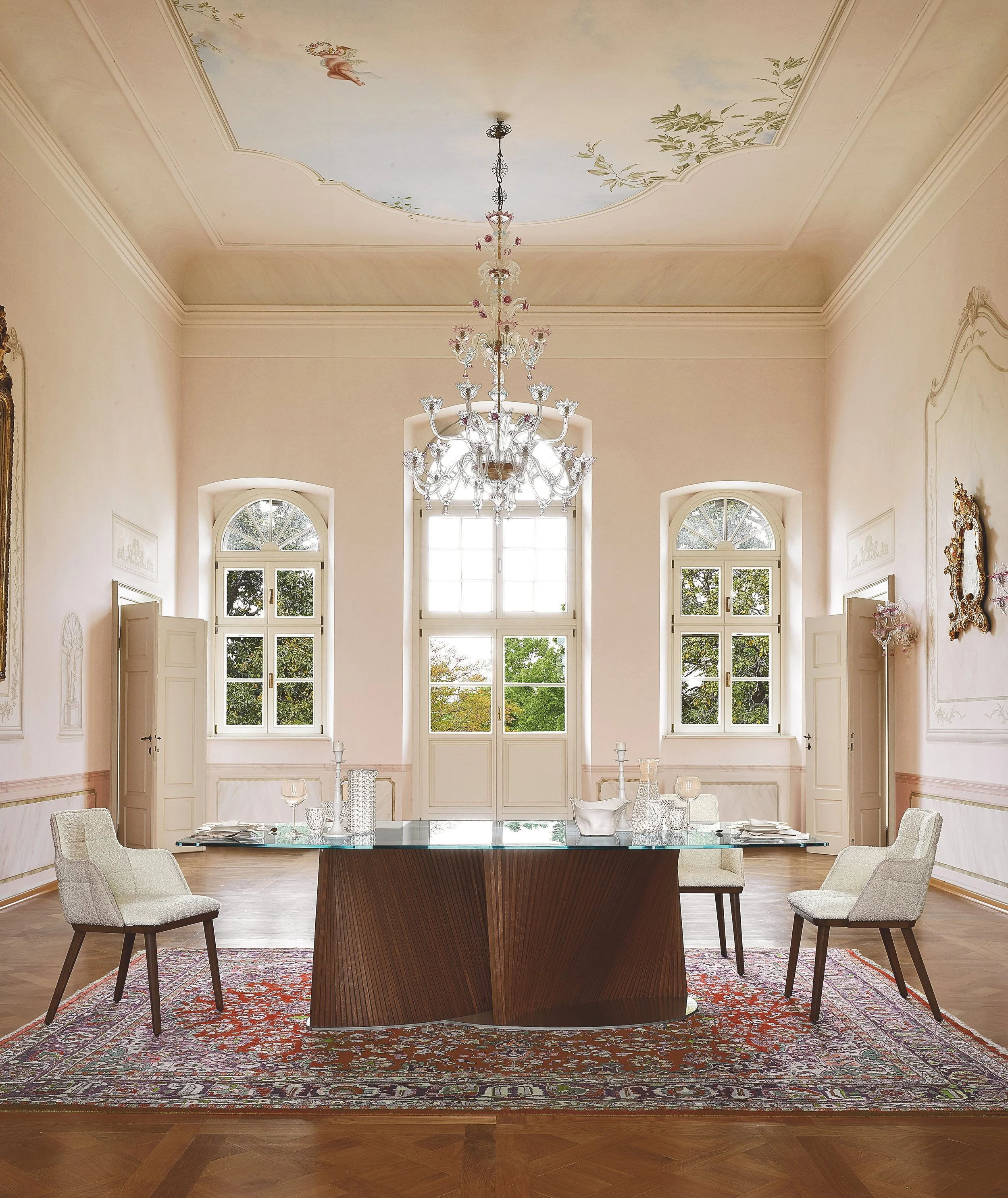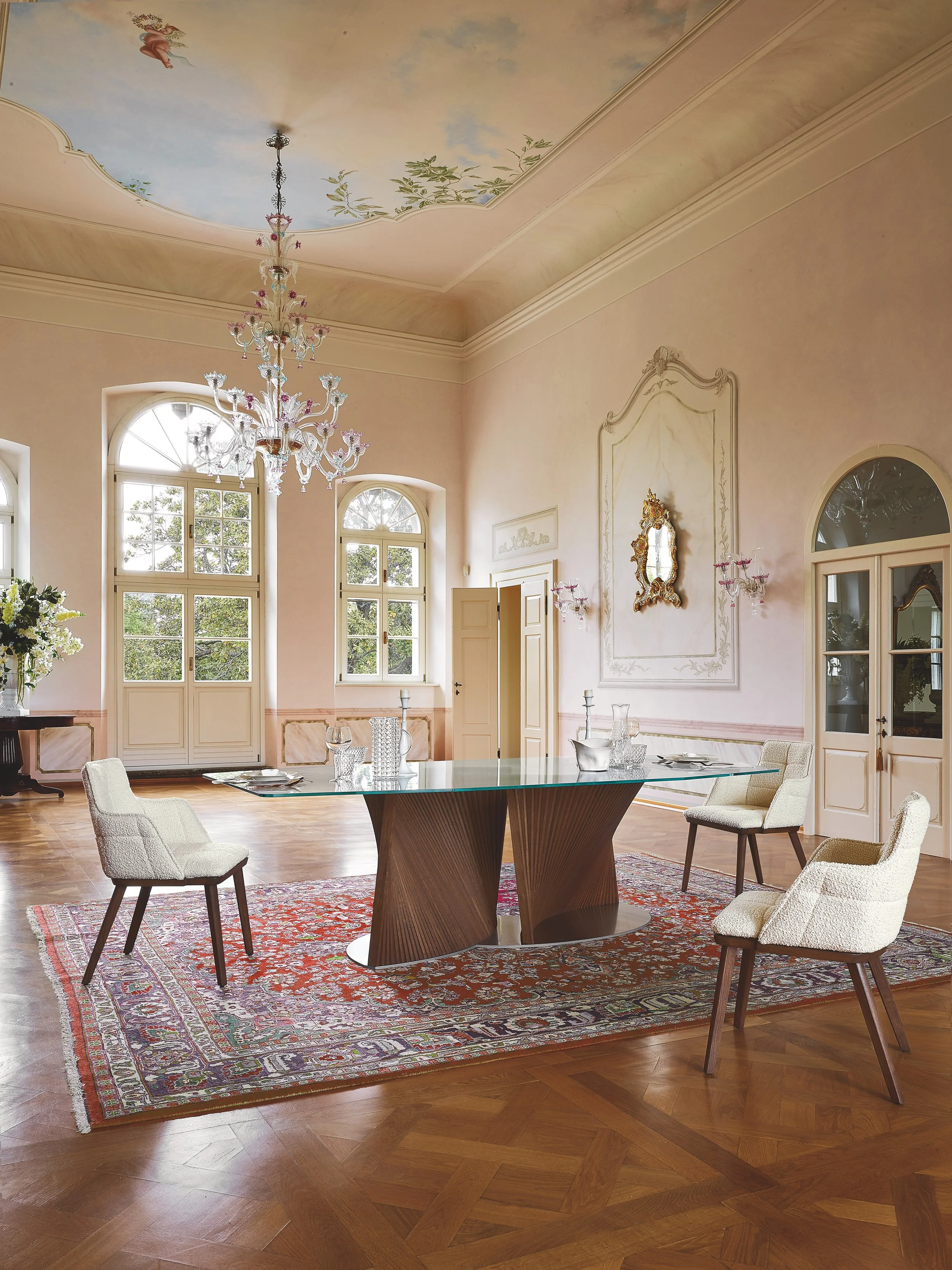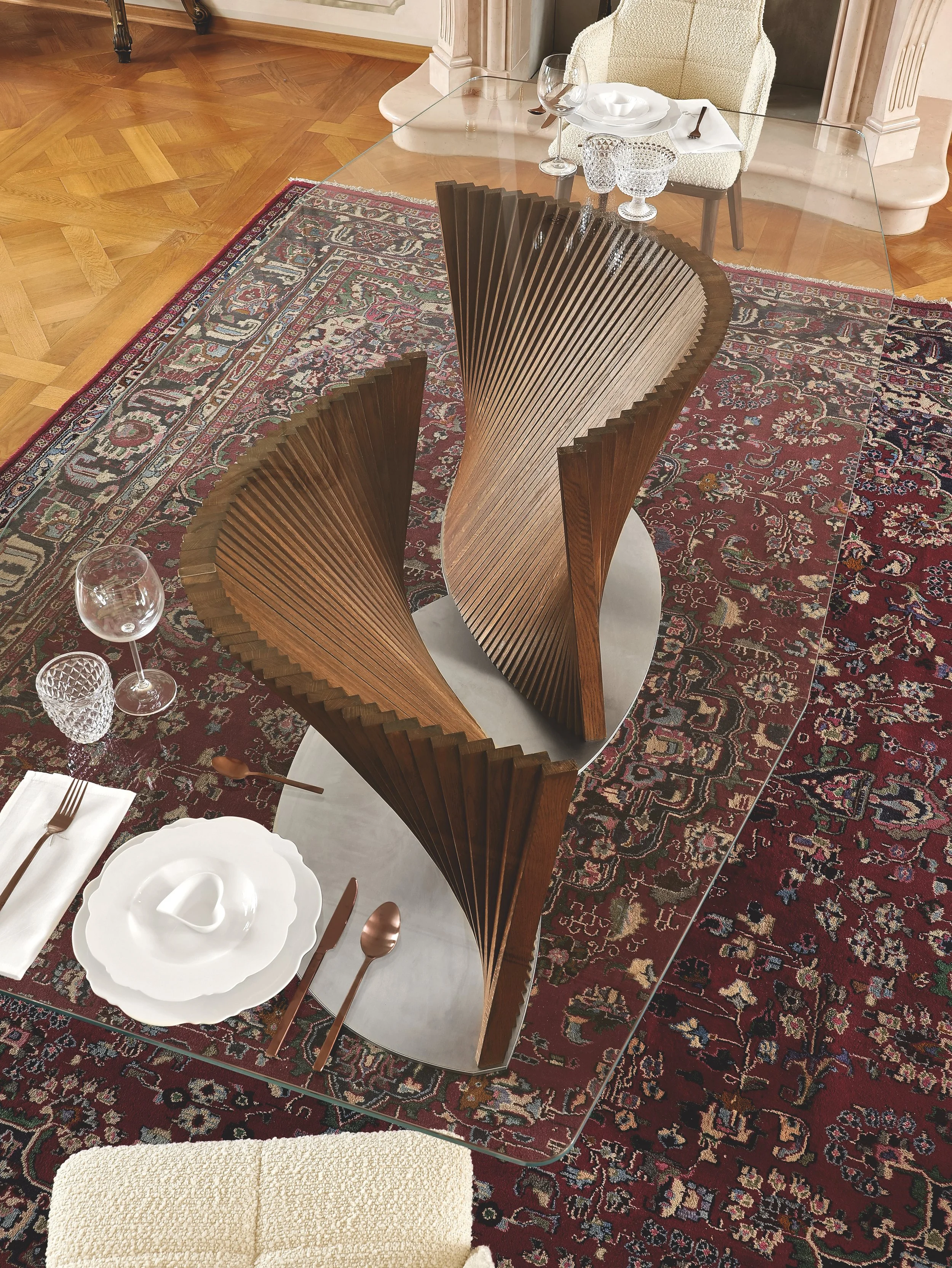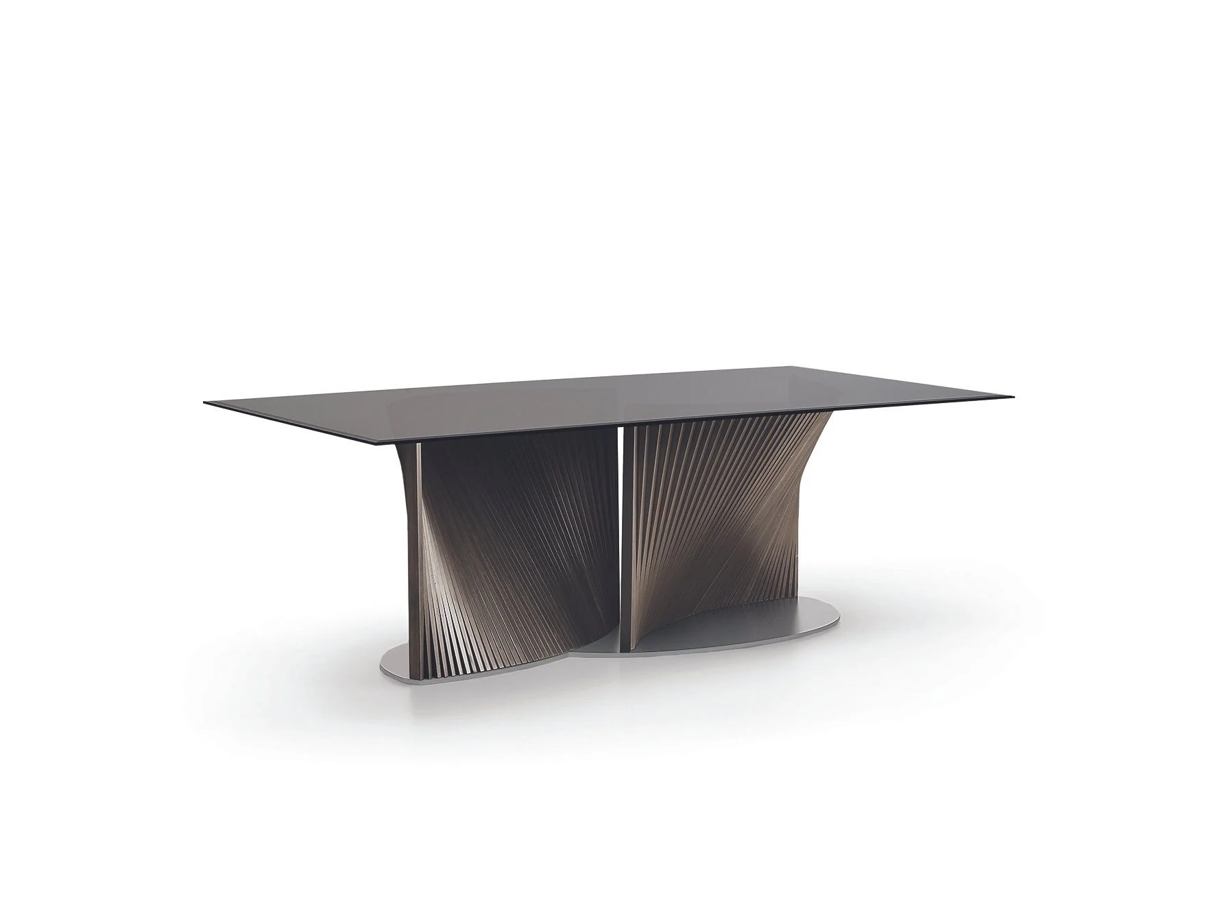 This exceptional table design showcases a base crafted from two "waves" that resemble the graceful petals of a flower. The soft curves offer substantial support for the sizable top, which is available in two sizes and can be either shaped glass or barrel-shaped porcelain. It's a truly extraordinary piece!