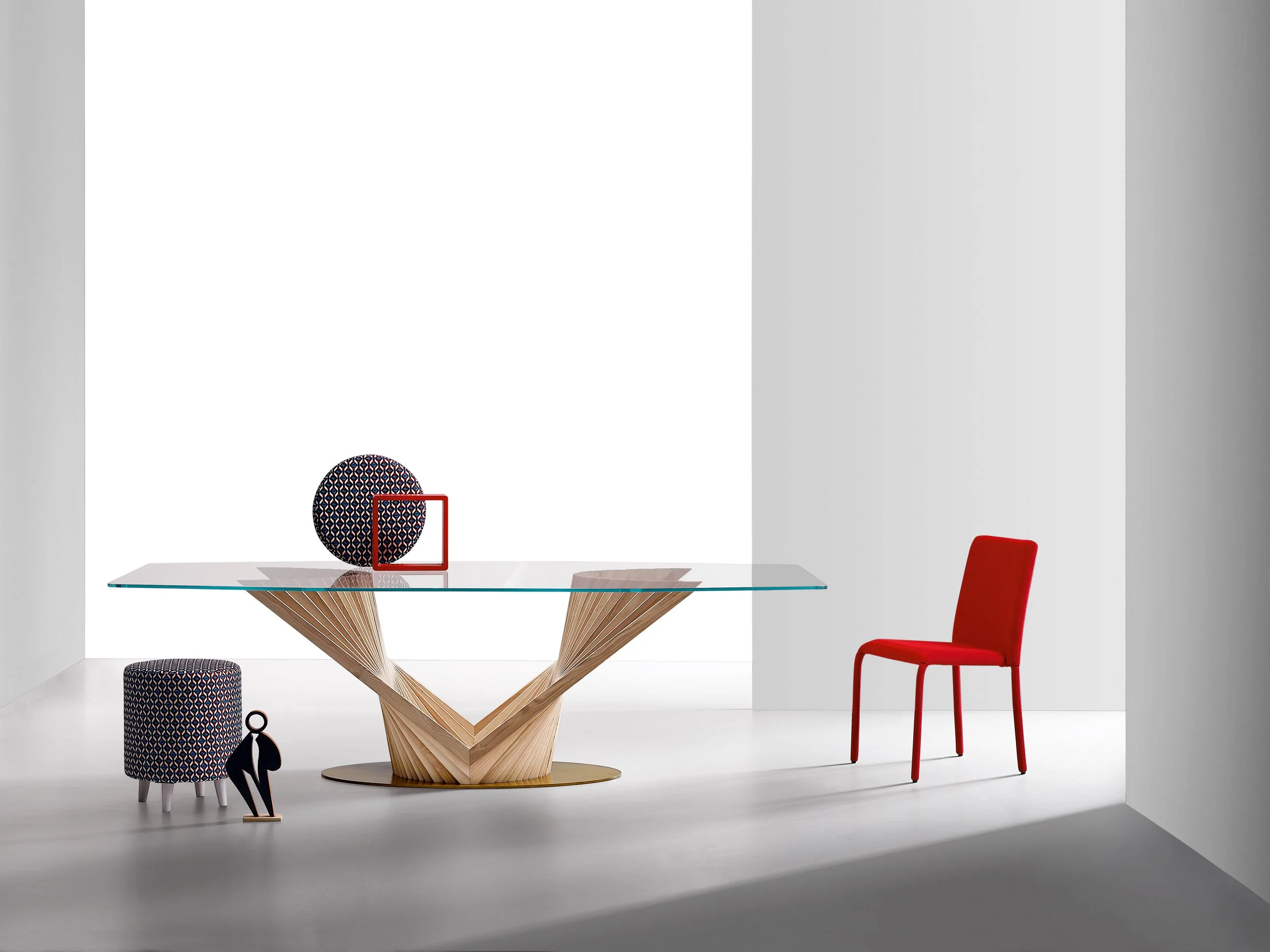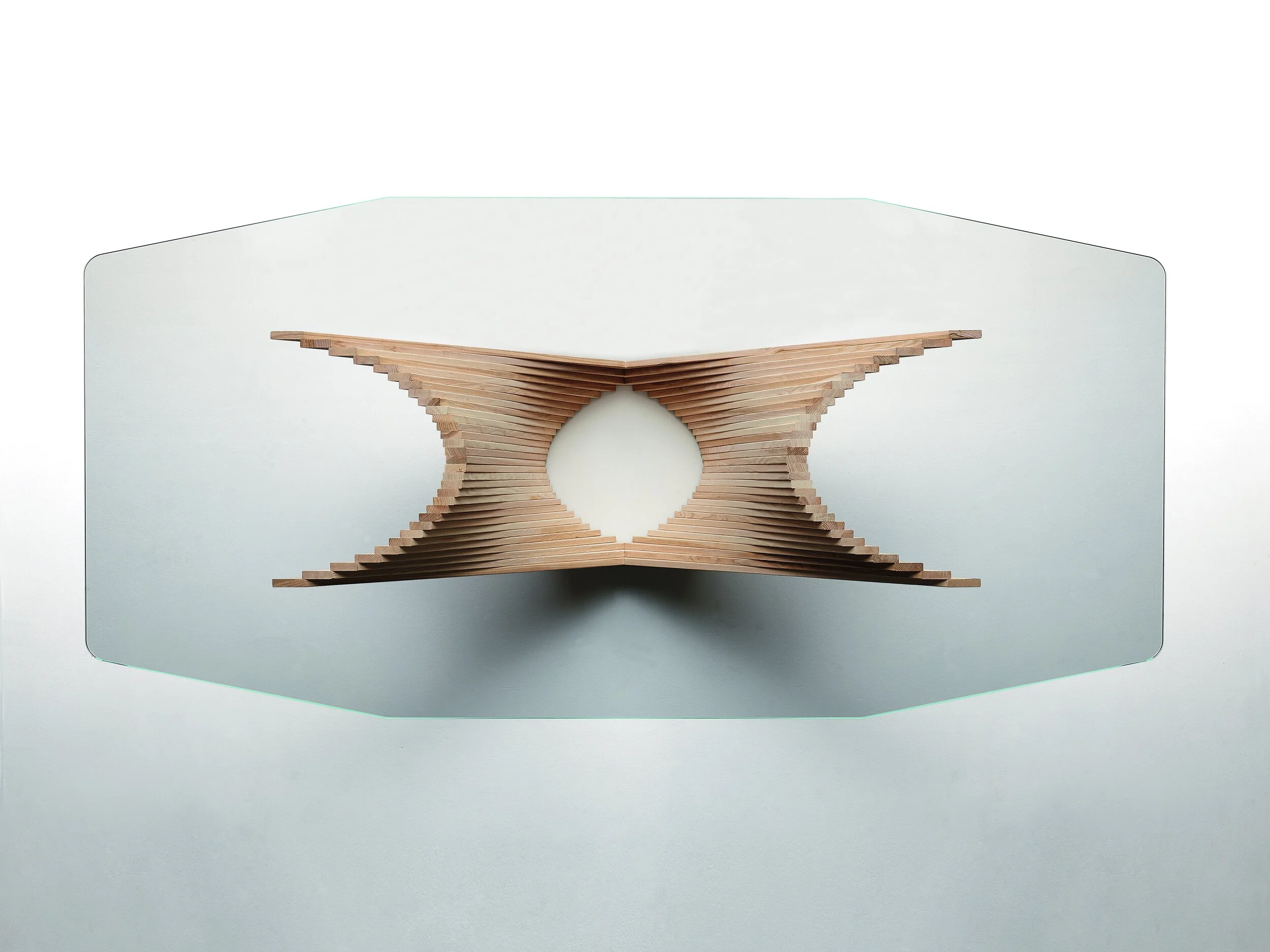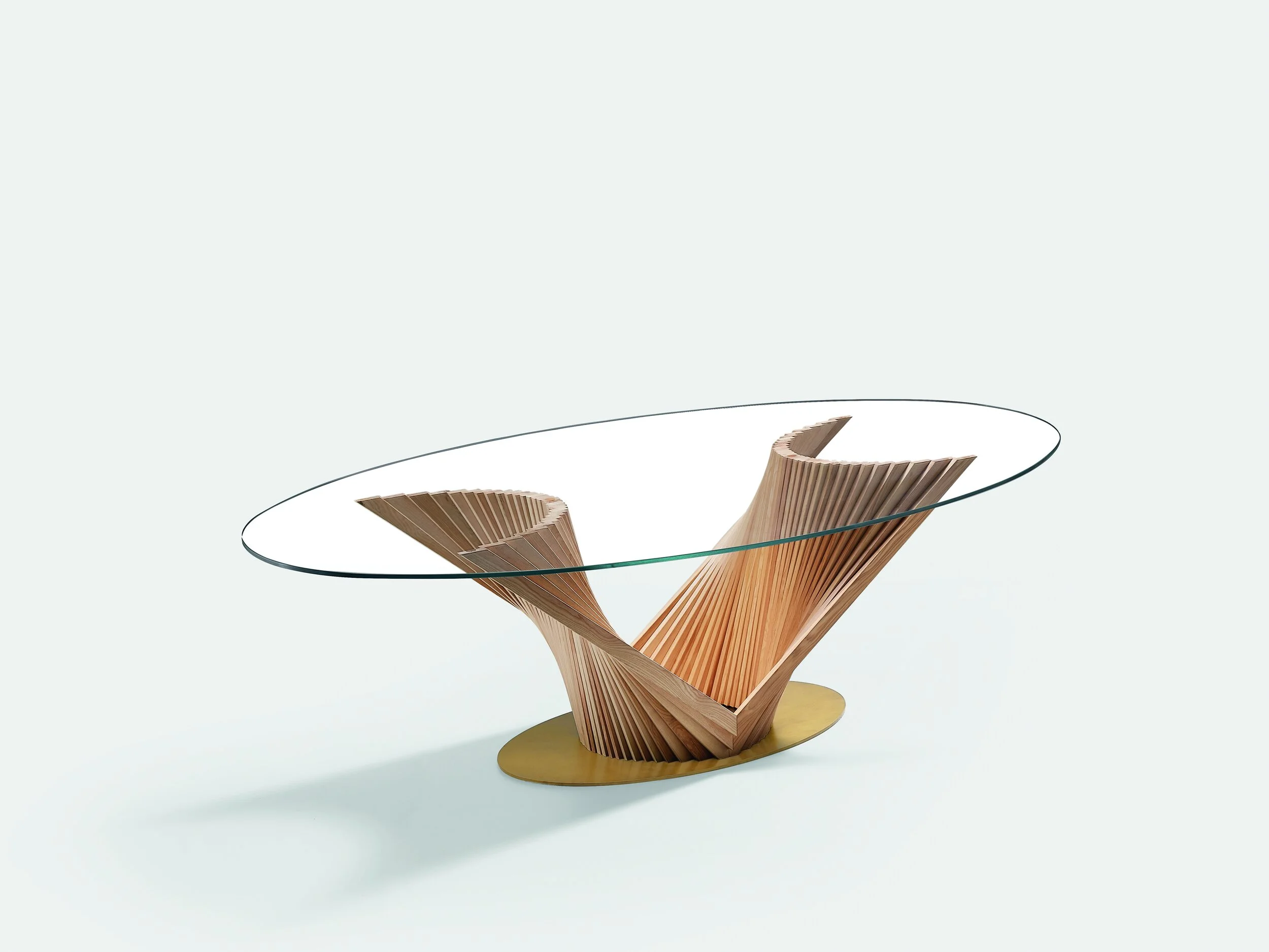 The base of this table is made up of wooden strips that flow seamlessly to create smooth, curvaceous lines. Available in clear glass tops that allow you to have a perfect view of this striking base from all angles.
