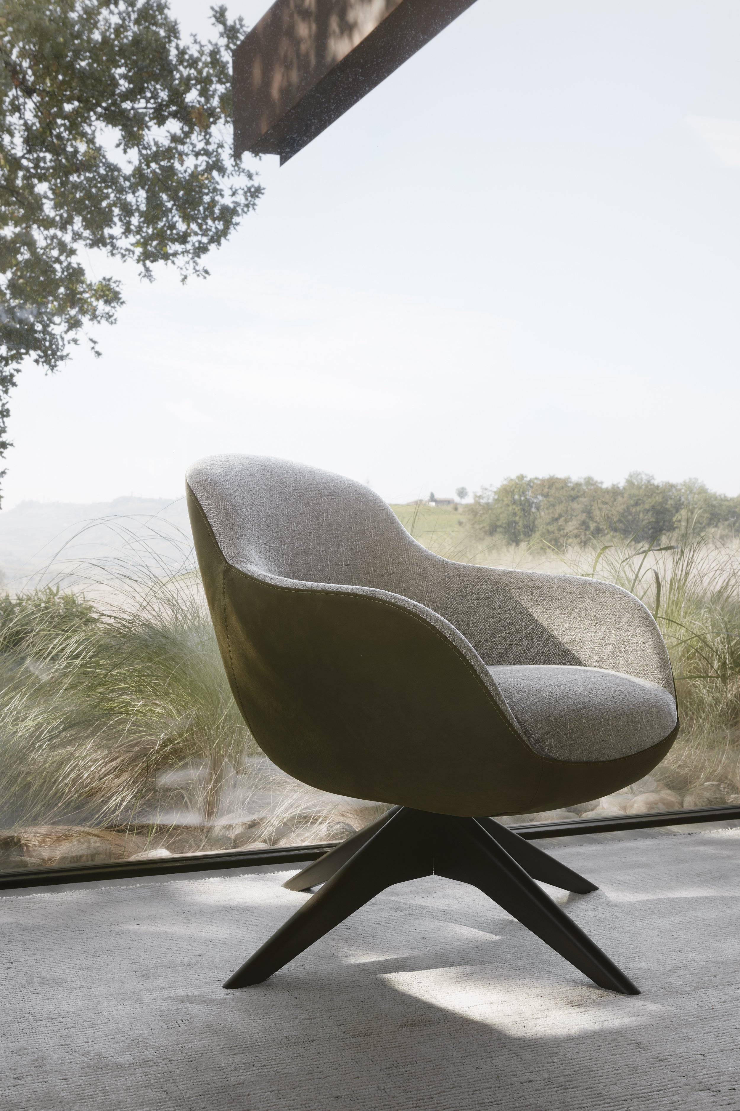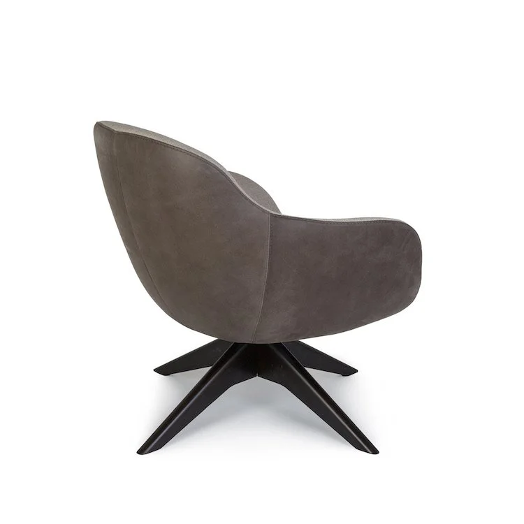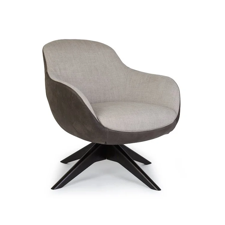 The Pearl lounge chair is available to be ordered in a fixed leg or a swivel base , with two different materials: fabric or leather on the back, and a distinct fabric or leather in the interior body.
