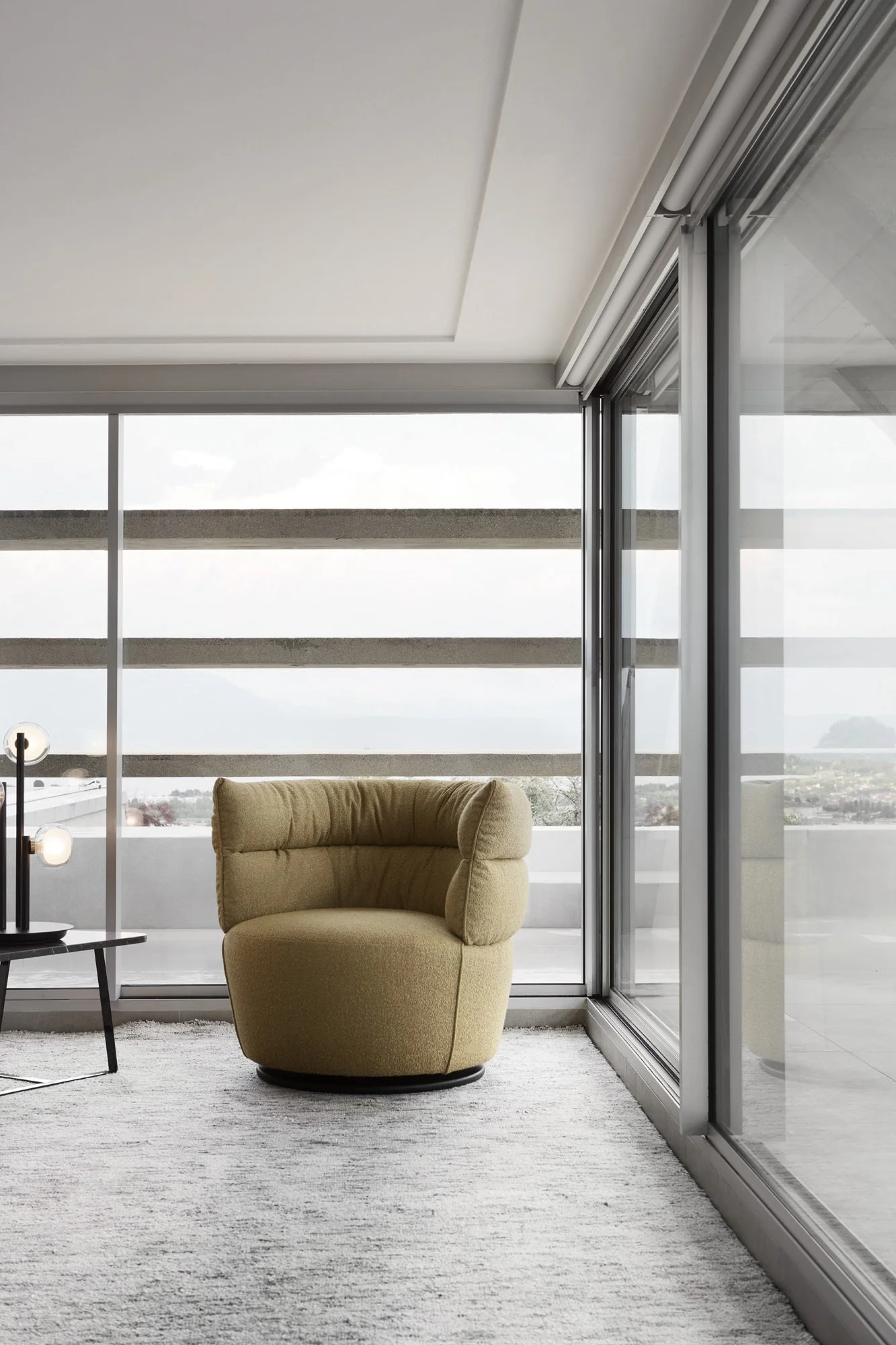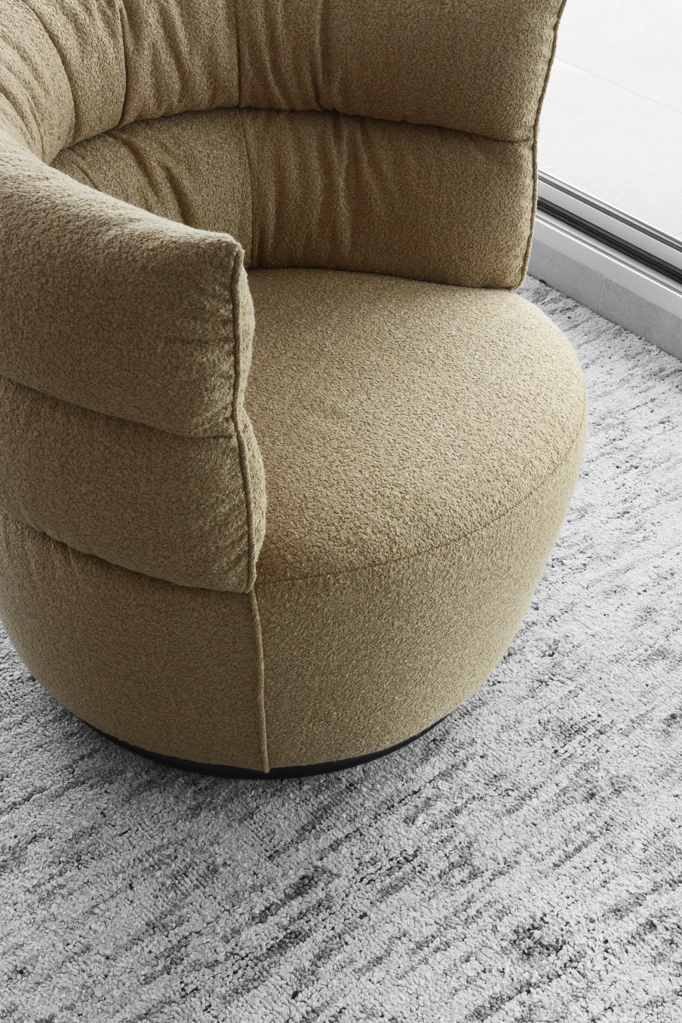 This swivel chair is distinctive, and has rich, soft padding and stitching that “runs” along the entire surface of the backrest.