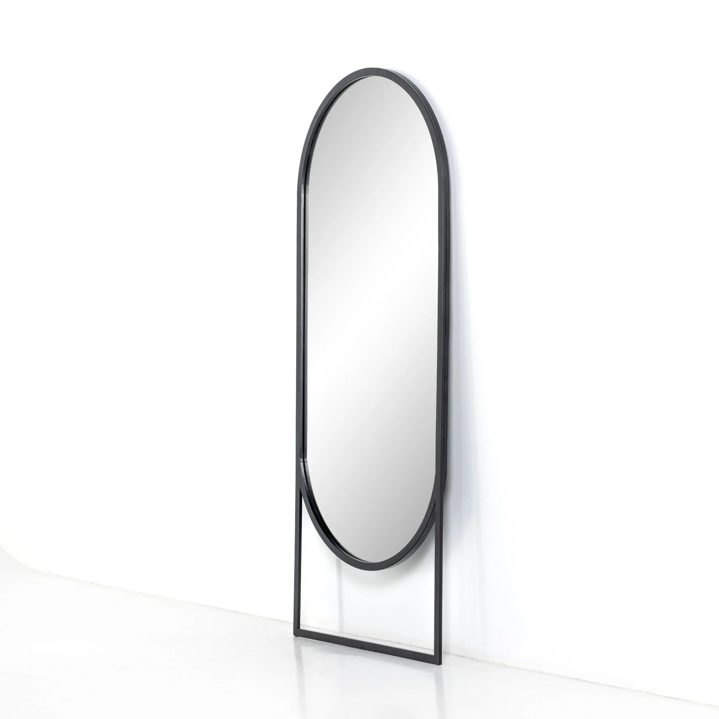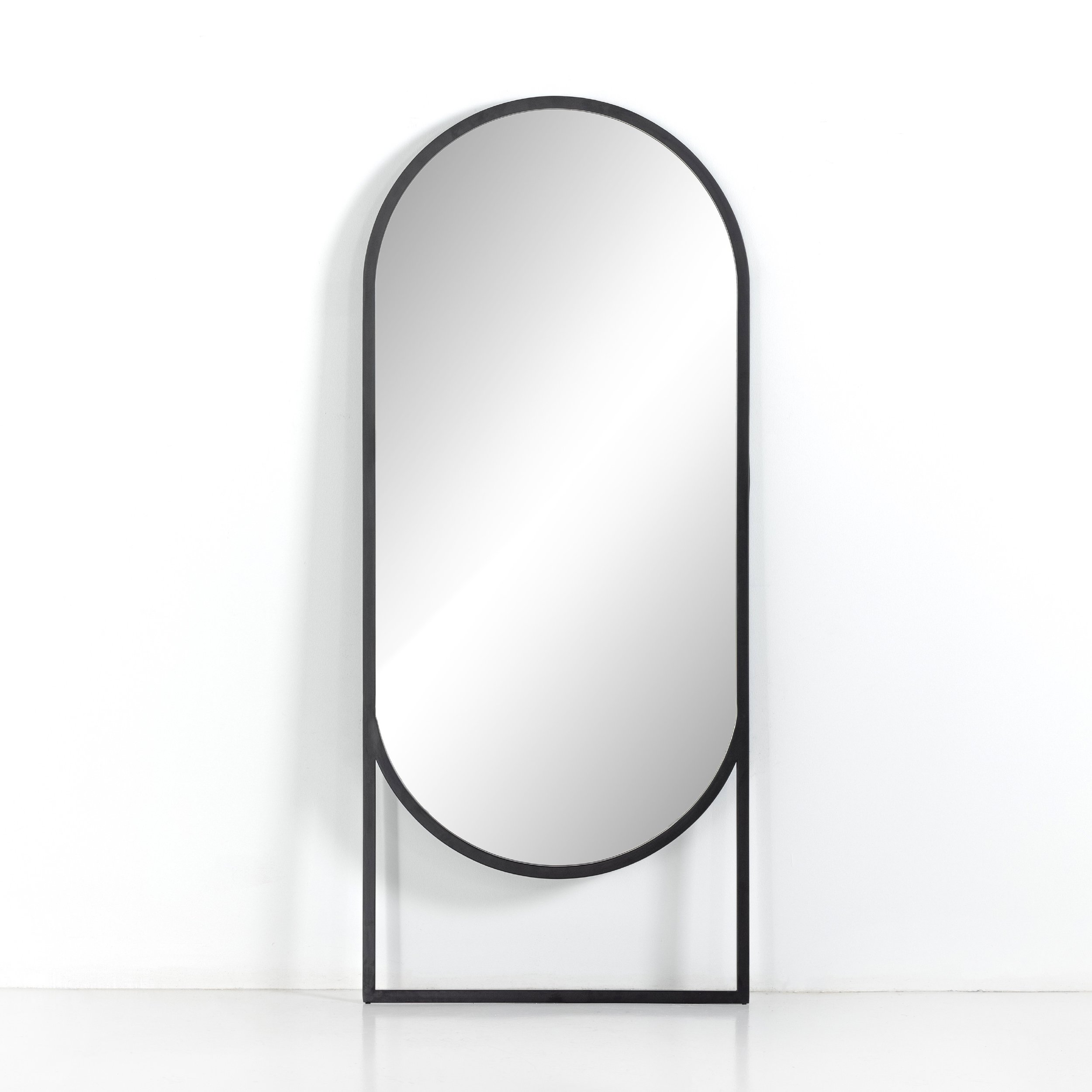 The Blake Mirror is framed in a arched silhouette in a matte black iron finish.