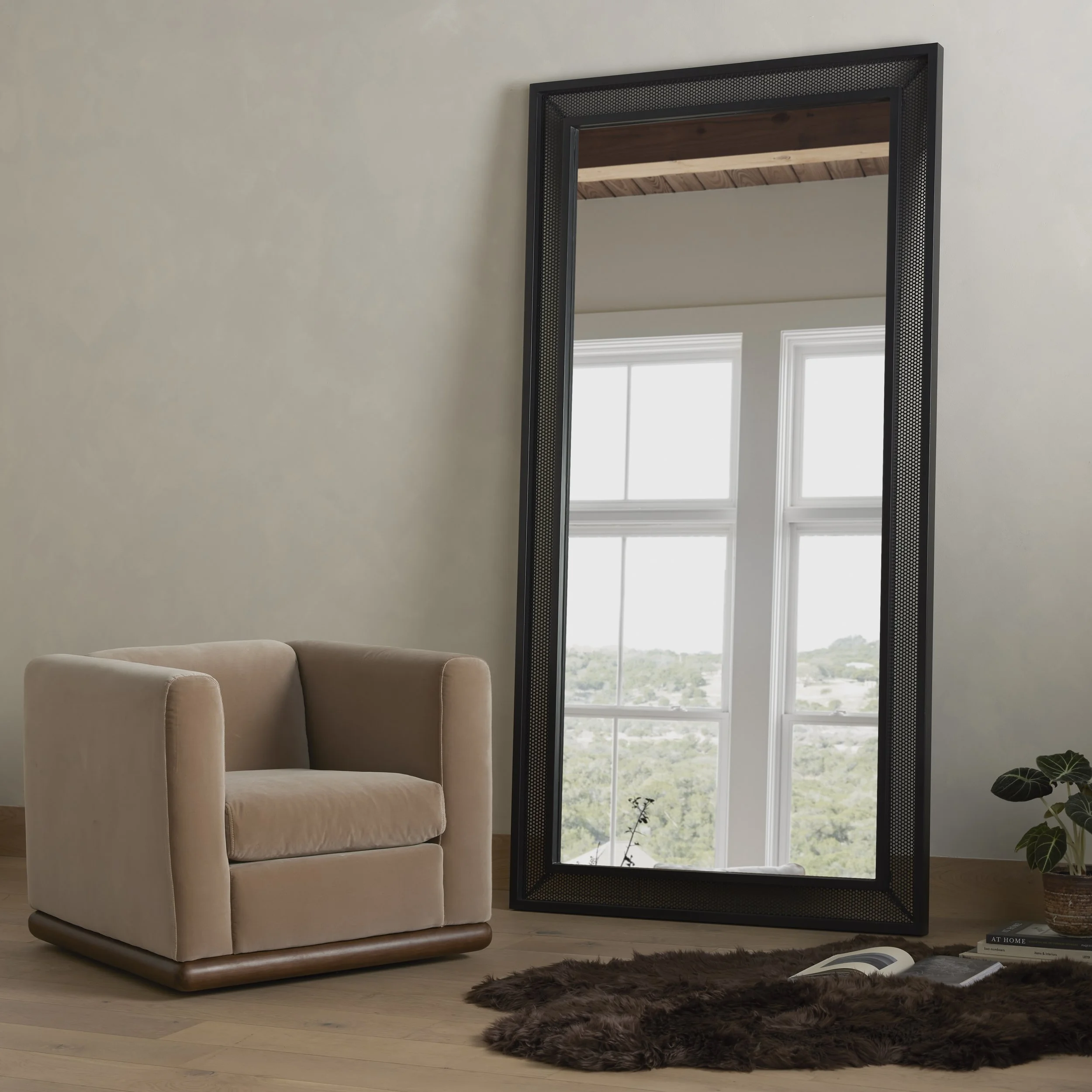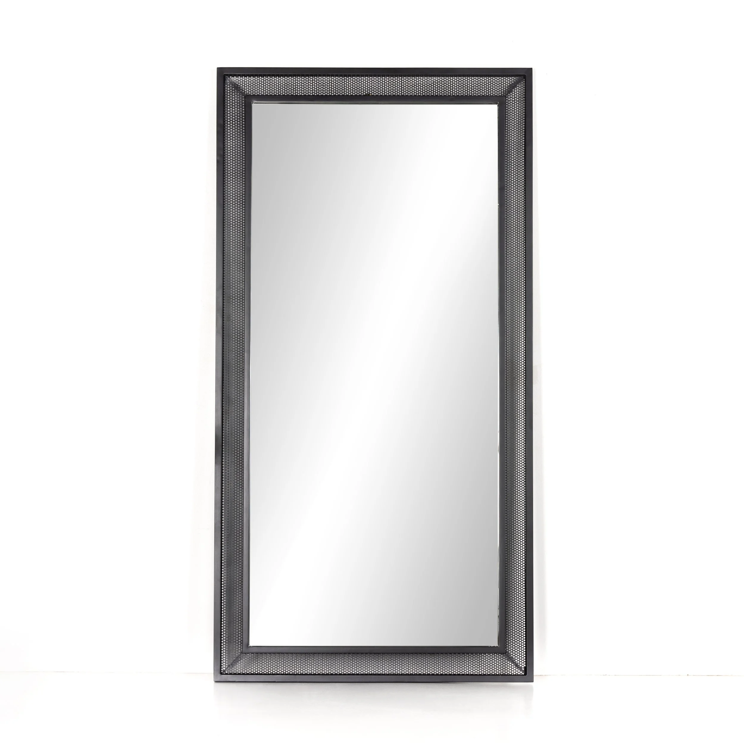 The Melodias Mirror is framed by a gunmetal finished iron, and perforated brass.