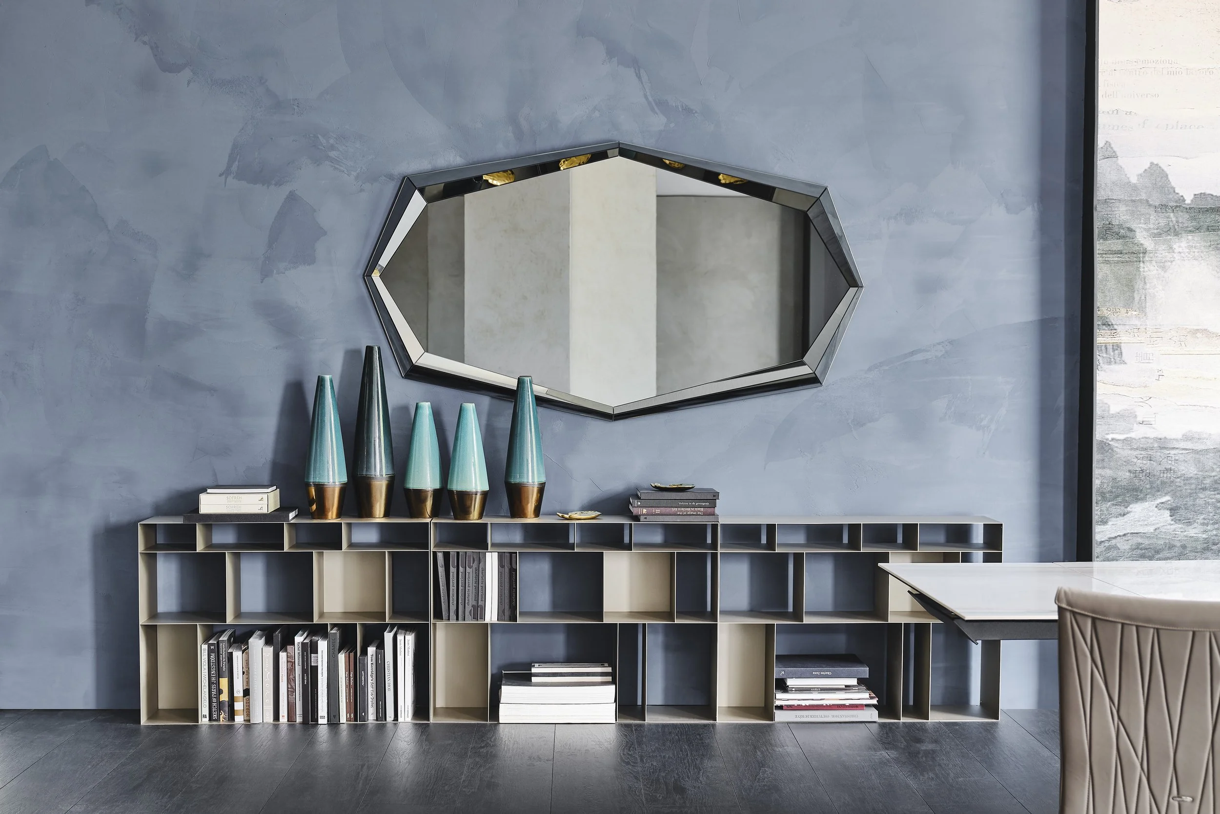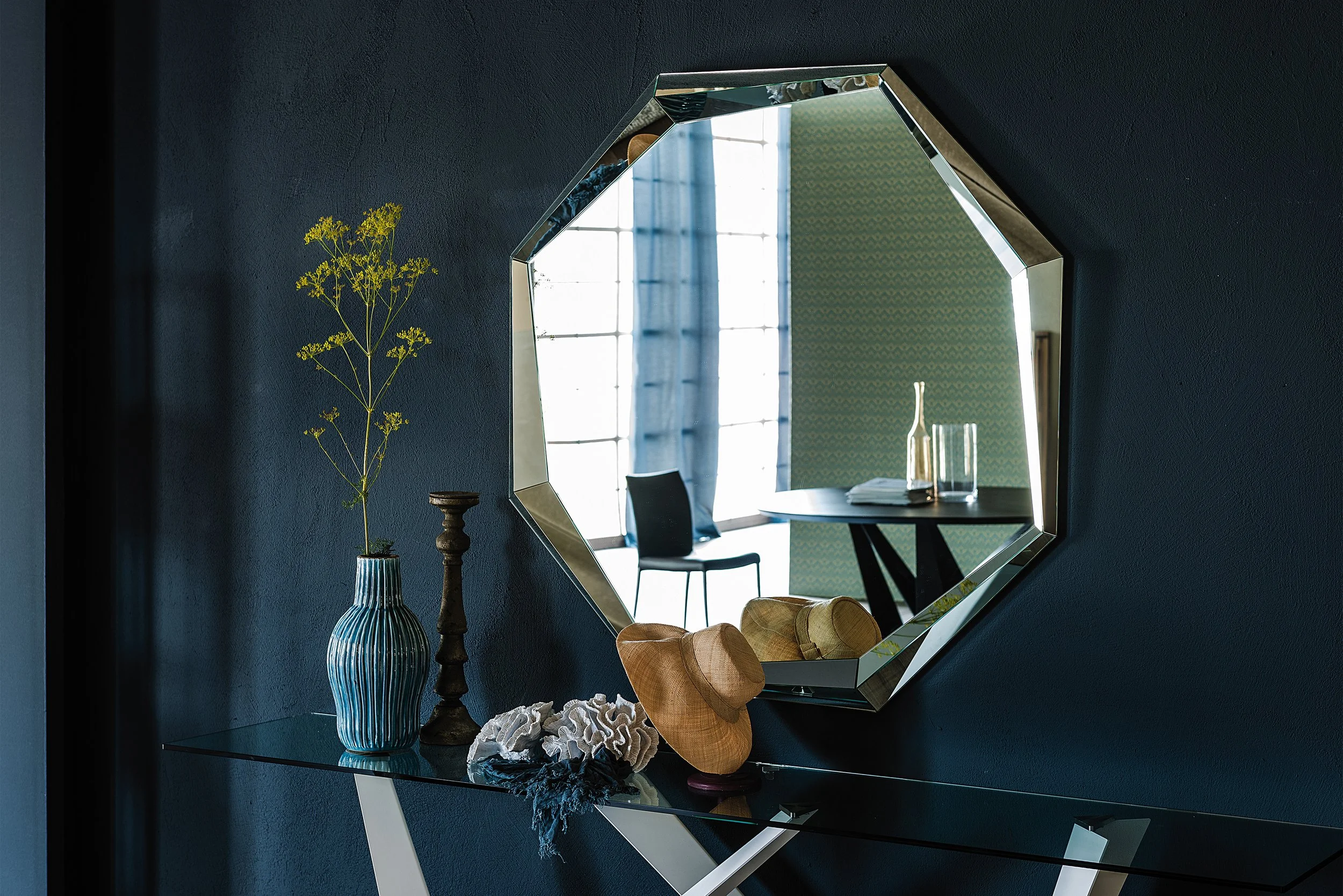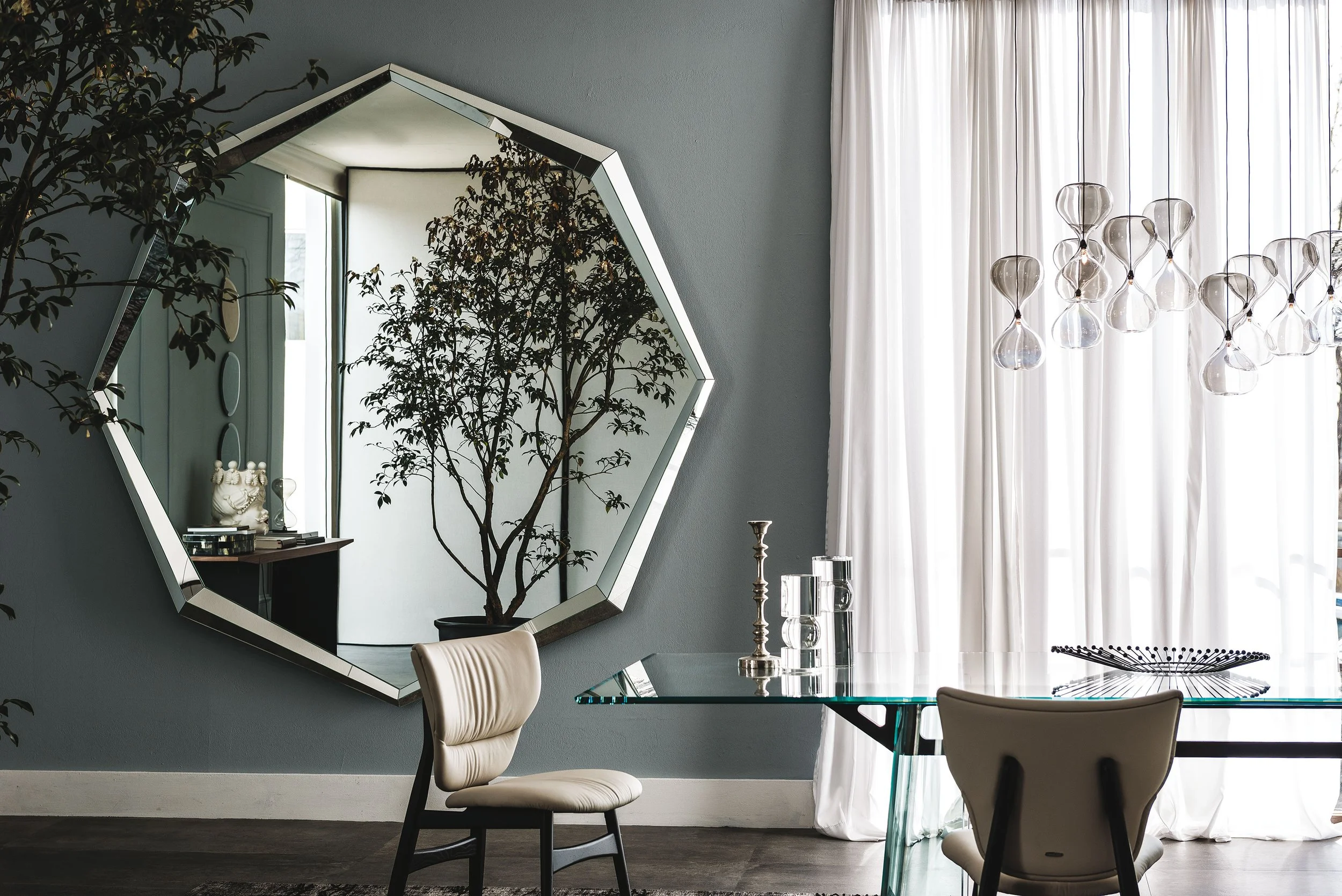 Having a mirrored frame, you have reflections of different views, further expanding the room, and bringing in different perspectives. The smaller rectangular or round mirror is available in a fumé glass mirror. Really making it a brilliant accessory.